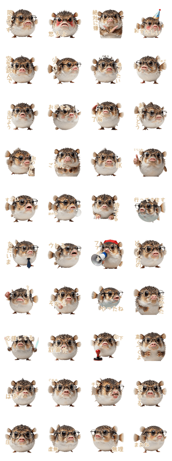 | スタンプ説明 | 歓迎会の余興でいじられた「怒ると膨らむフグ」が登場。限界寸前、パンパンに膨らんで抗議します。シュールな怒りや虚無感、日々の挨拶で会話に圧をかけよう。 |