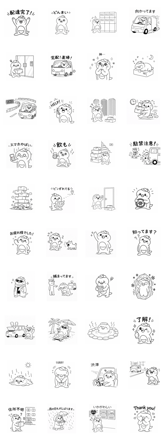 | スタンプ説明 | 配送業者あるあるのスタンプです。 ペンギンが配送のために奔走。 |
