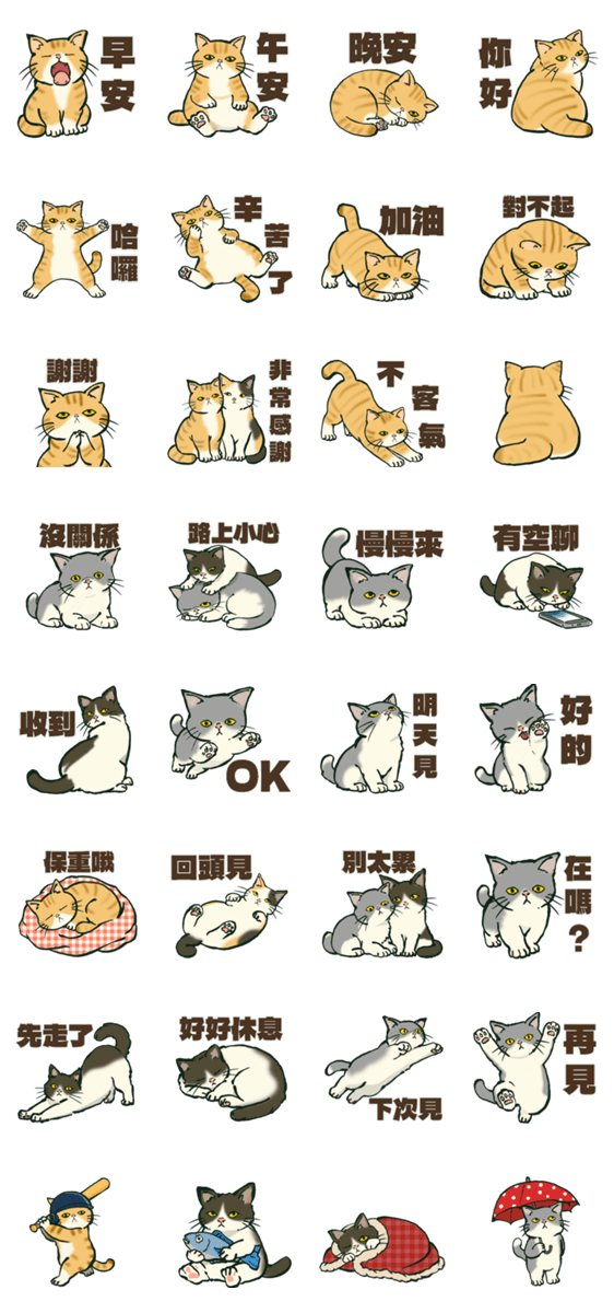 Cute cat stickers for everyday greetings. Good morning, hello, good night, thanks, OK, and more. Perfect for daily chats.