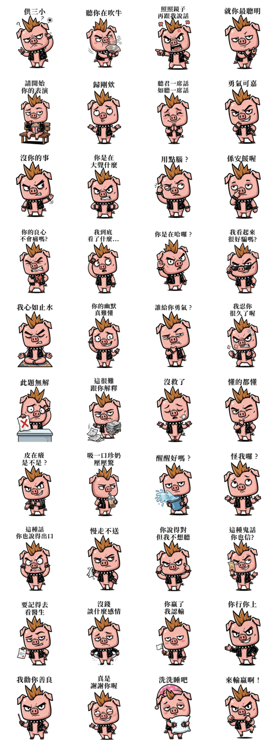 | スタンプ説明 | 反逆児「パンク豚」が登場!「何言ってんの?」など、シュールで毒舌な表現でトークを盛り上げよう。 ※このスタンプはトークルームで大きく表示されるBIGスタンプです。 |