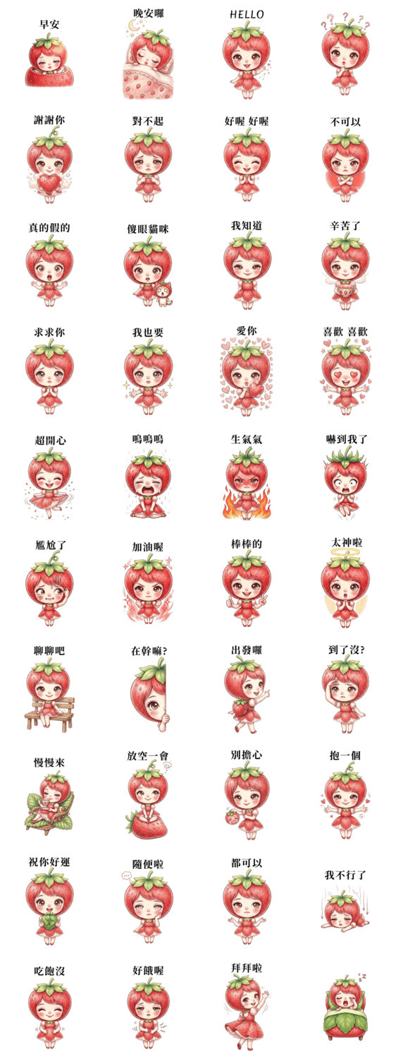 | スタンプ説明 | 優しく微笑むイチゴの女の子が、あなたの心を癒やします。大切な人へのメッセージにぴったりのスタンプです。 ※このスタンプはトークルームで大きく表示されるBIGスタンプです。 |