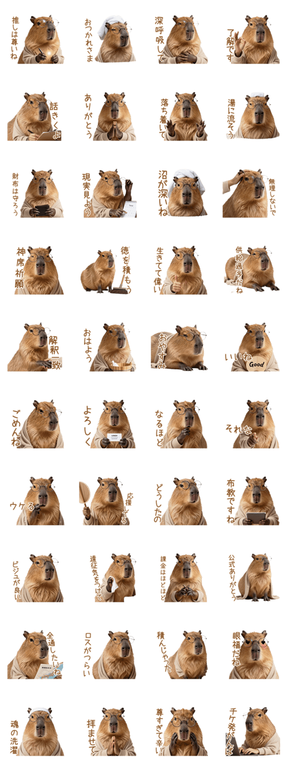 | スタンプ説明 | 温泉好きな癒しカウンセラーカピバラ先生が、推し沼にハマる心を診断。尊い、課金、遠征等の推し活疲れを湯に流そう。オタク友達との会話や自分への戒めにも。 |