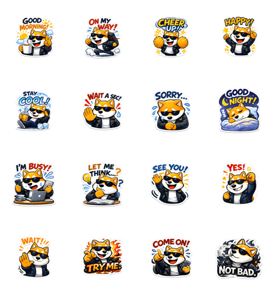 サングラス姿のボスドッグが英語で気持ちを伝えるスタンプ。Good morningなど、仕事や日常で使いやすいフレーズがそろった、クールで前向きなリアクションシリーズです。