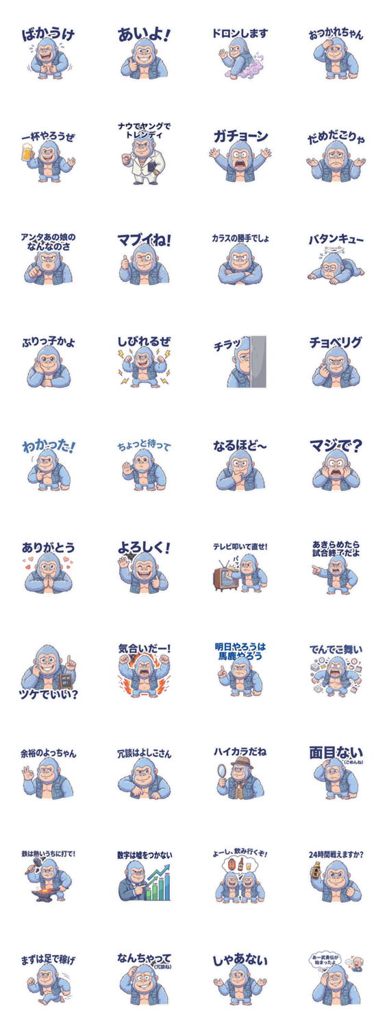 昭和レトロな可愛いゴリラキャラクター。 1980年代の流行語を使った表現が40個!シリーズ第1弾!