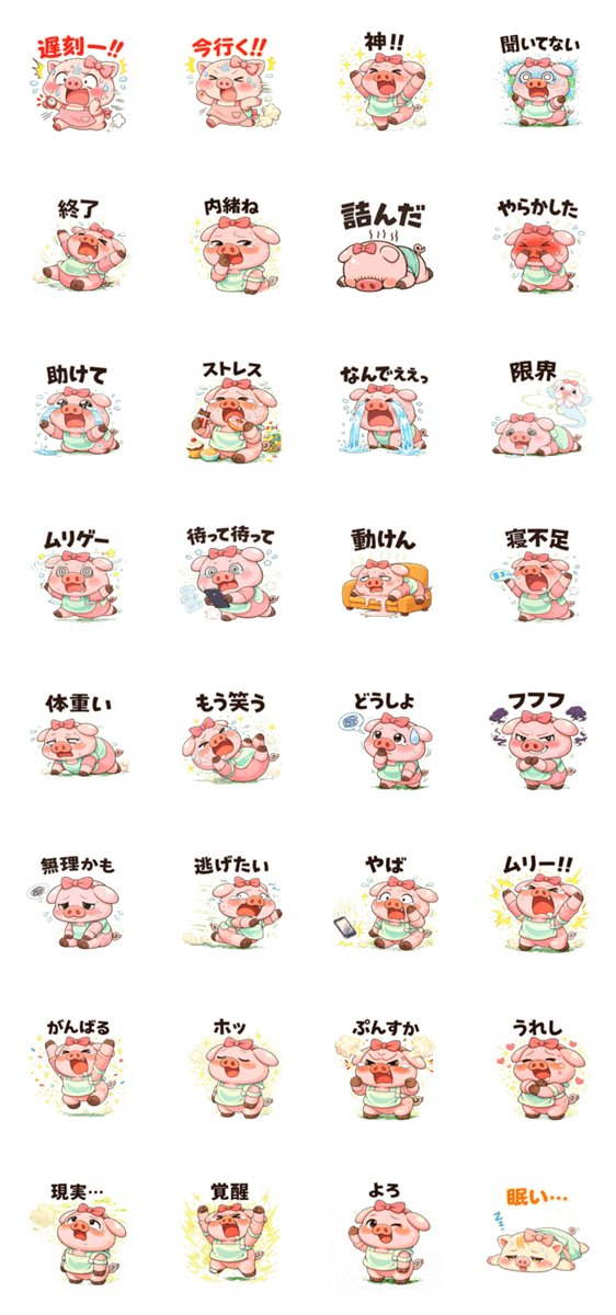 仕事や学校、日常で使える共感爆発スタンプ。遅刻、やらかした、助けて、終わったなど本音を可愛いブタが全力表現。社会人や学生のトークにぴったり。