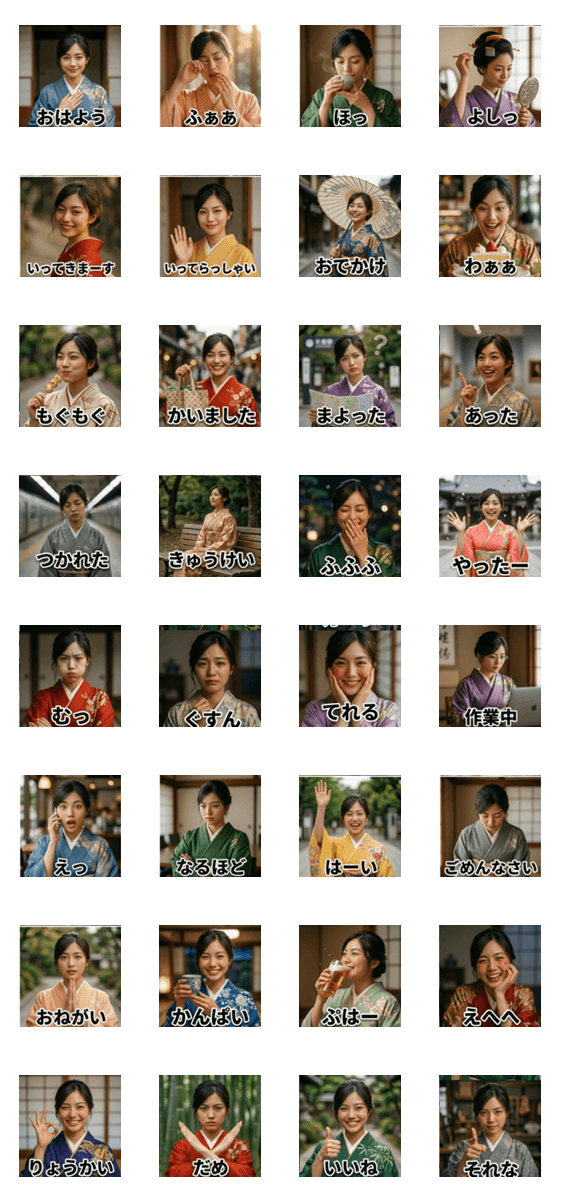 和服を纏った美しい女性が、日々の生活を優雅に彩ります。挨拶から畳でのんびりする姿まで、情緒あふれるスタンプです。
