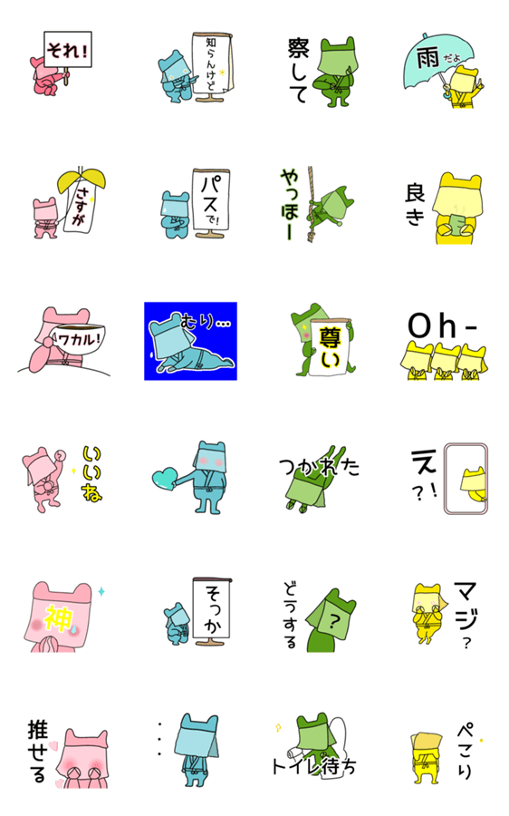 | スタンプ説明 | 「今、何してる?」が秒で伝わる!4色の黒子が今の状況を可愛く代弁。 雨の日もトイレ待ちも、この子たちが角を立てずにゆるっと伝えてくれます。 |