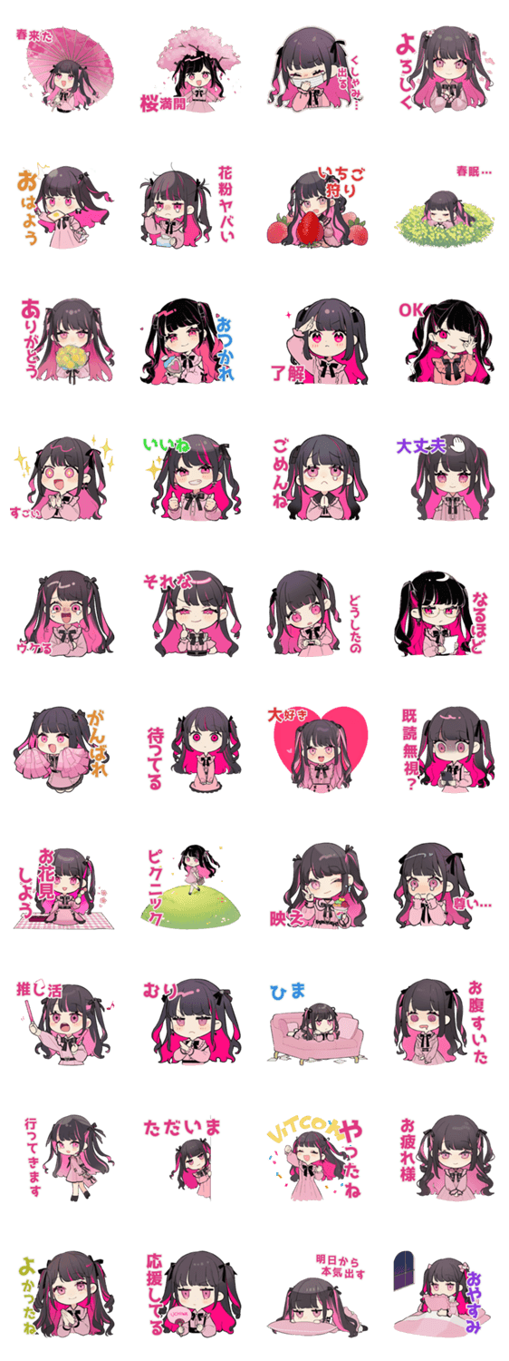 ピンクで可愛いちび量産型ちゃんの春スタンプ。地雷系/メンヘラ/推し/ぴえん/桜/花粉症/挨拶/日常/面白い/友達/女子/恋人
