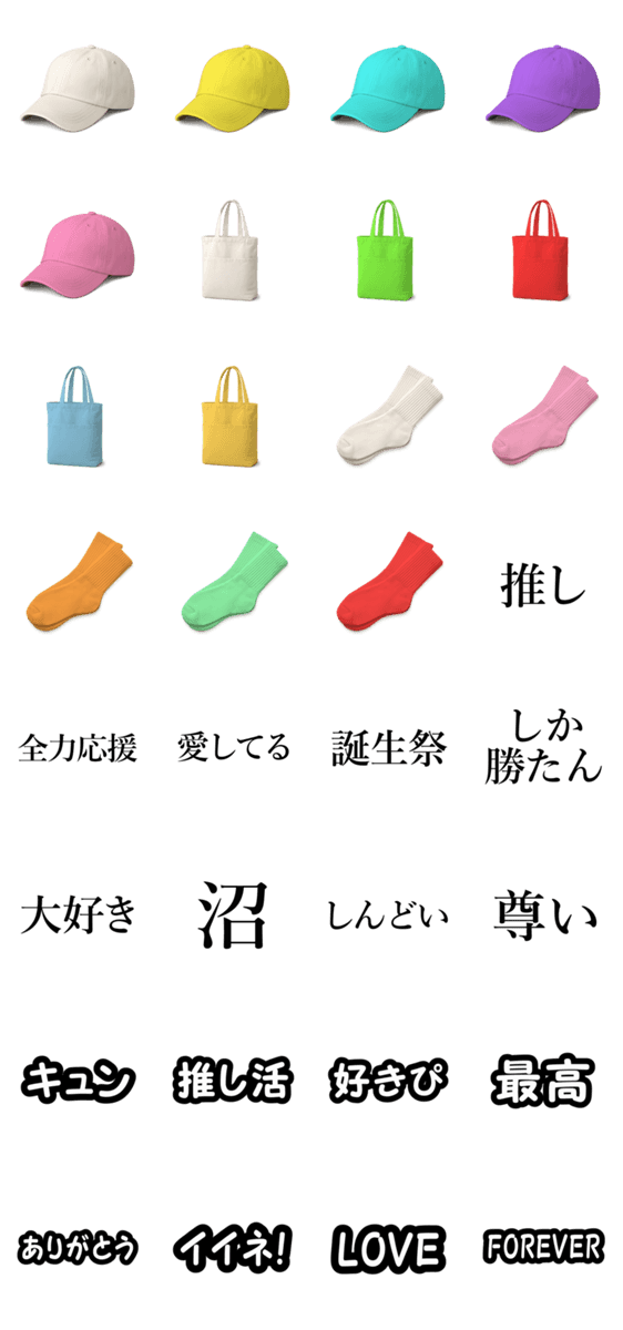 アレンジ機能を使って推し色のトートバッグやキャップ・靴下に自由に言葉や好きなキャラのスタンプなどをコラージュしてオリジナルの推し活グッズが作れます♪