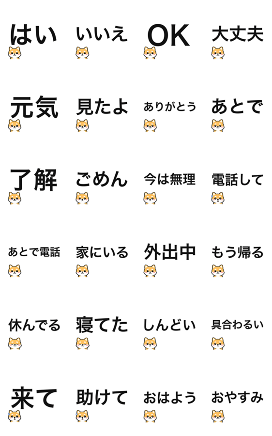 | スタンプ説明 | 親から子への返信に。はい、いいえ、大丈夫、見たよ、あとで電話してなど、大きな文字で短く返せる使いやすい返信スタンプです。 問いかけ編と併せて利用すると便利です。 |
