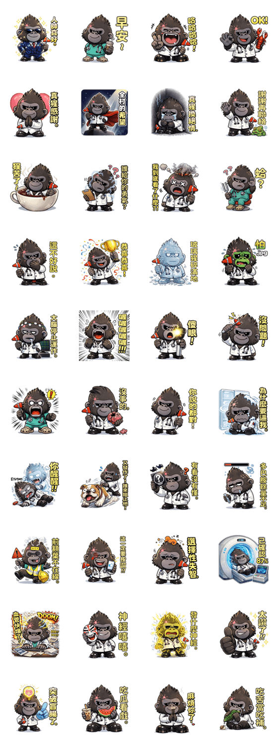 | スタンプ説明 | A mischievous chibi gorilla doctor reacting to everyday moments. Perfect for work, friends, and funny situations. Cute, sarcastic, and full of personality! |
