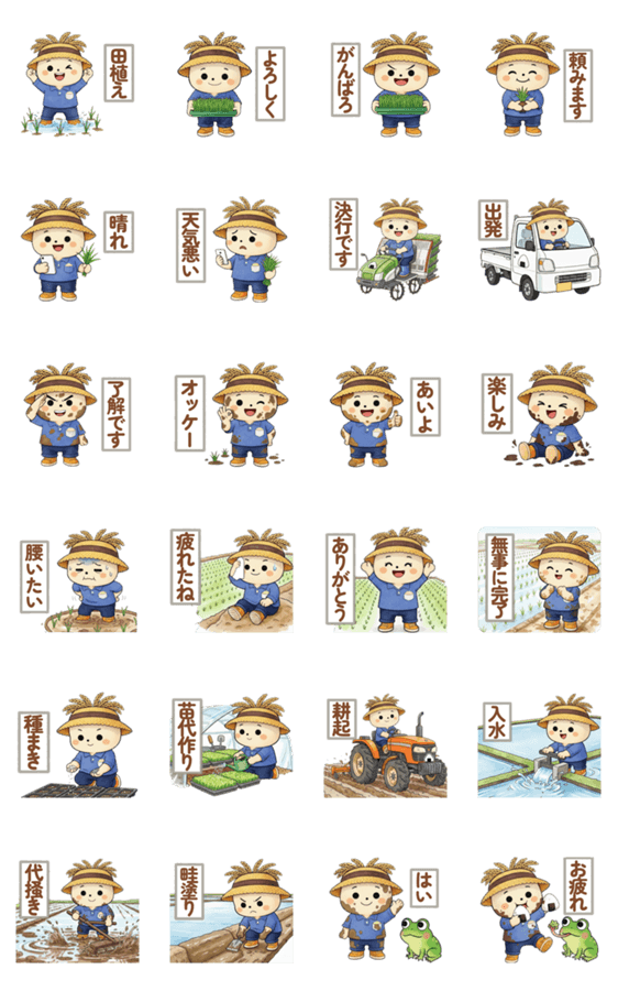 米農家さんの作業連絡に使えるスタンプです。 田植えや代かき、天気連絡など、現場で使いやすい言葉を集めました。