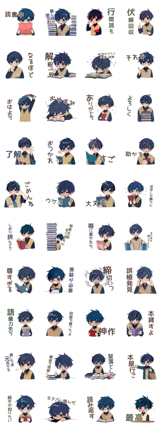 本好き男子のスタンプ!読書や趣味の返信に便利/眼鏡/文系/インテリ/日常/挨拶/毎日/使える/かわいい/シンプル/ゆるい/推し/友達/男子/学生/社会人/本
