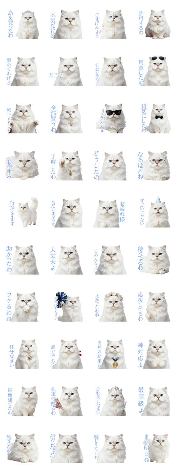 | スタンプ説明 | ツンデレ高貴な白猫は嘘をつかない。島購入もリムジンも全部ガチ。エイプリルフールも通常運転な、シュールで面白いネタ系スタンプです。 |