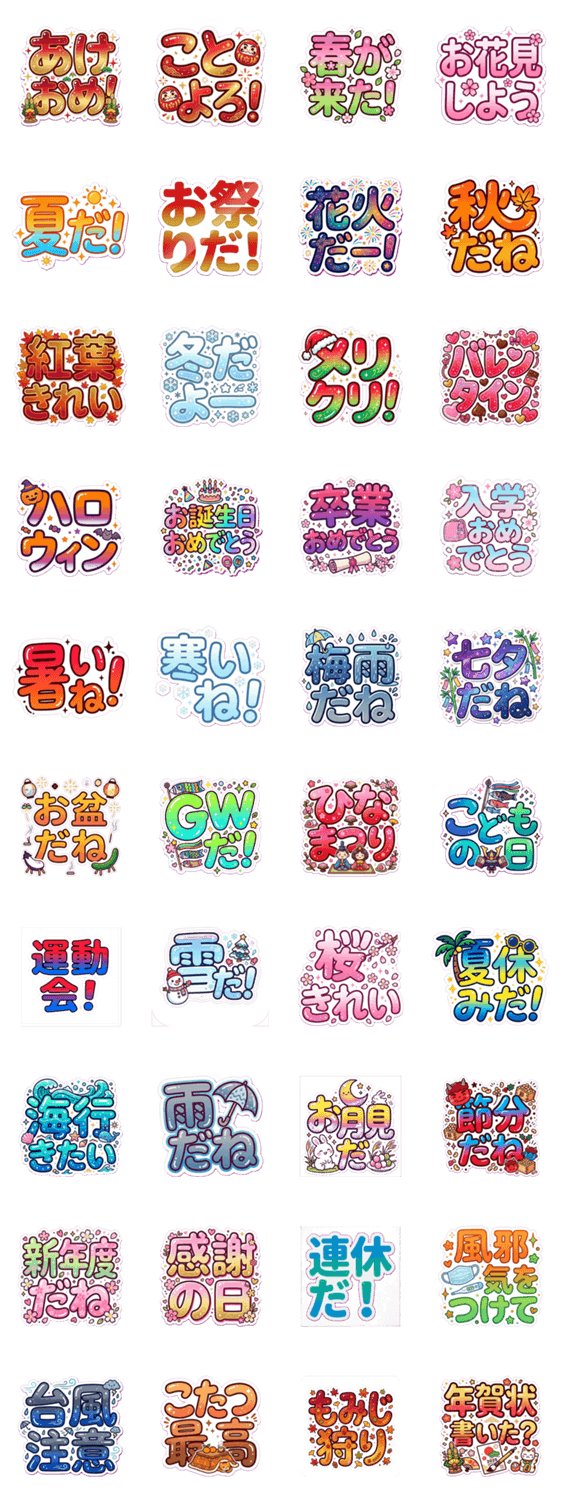 でか文字40種!あけおめ,メリクリ,お花見しよう等の季節挨拶からお誕生日おめでとう,卒業おめでとう等のお祝いまで。春夏秋冬の行事に使えるスタンプ