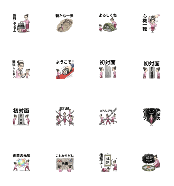 | スタンプ説明 | 新人を迎え入れる先輩たちが使える変化球的インパクトあるフレーズの数々。クセが強いメガネ女子が新人後輩たちにギャグを交えながら伝える。短期間での距離感詰めに最適! |