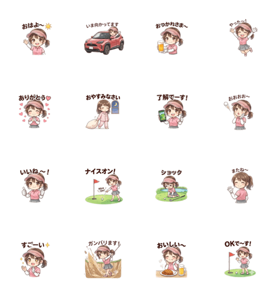 元気いっぱいのゴルフ女子が日常で使える挨拶スタンプです。 「おはよう」などの挨拶やゴルフシーンでも使えます。 かわいくて使いやすい表情で、毎日活躍します♪