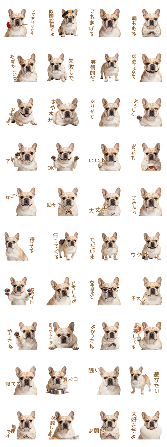 | スタンプ説明 | もちもちフレンチブルドッグのスタンプ。似顔絵や肩もみなど母の日のお祝いと、毎日使える挨拶を収録。犬好きや家族、ママ友との連絡に癒しを届けます。 |