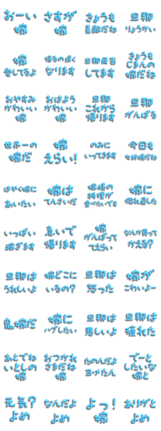 | スタンプ説明 | 日常/夫婦/ぷっくり/文字/メッセージ/シンプル/かわいい/嫁/旦那/敬語/甘め/ツンデレ/返信/既読/毎日/仲良し/シール/立体/3D/つやつや/愛/恋/おーい/好き/ボンボン/イチャ |