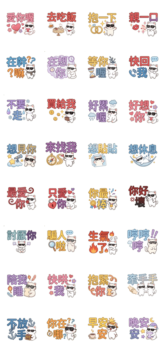 | スタンプ説明 | Sunglasses and white cat, give me a hug. |