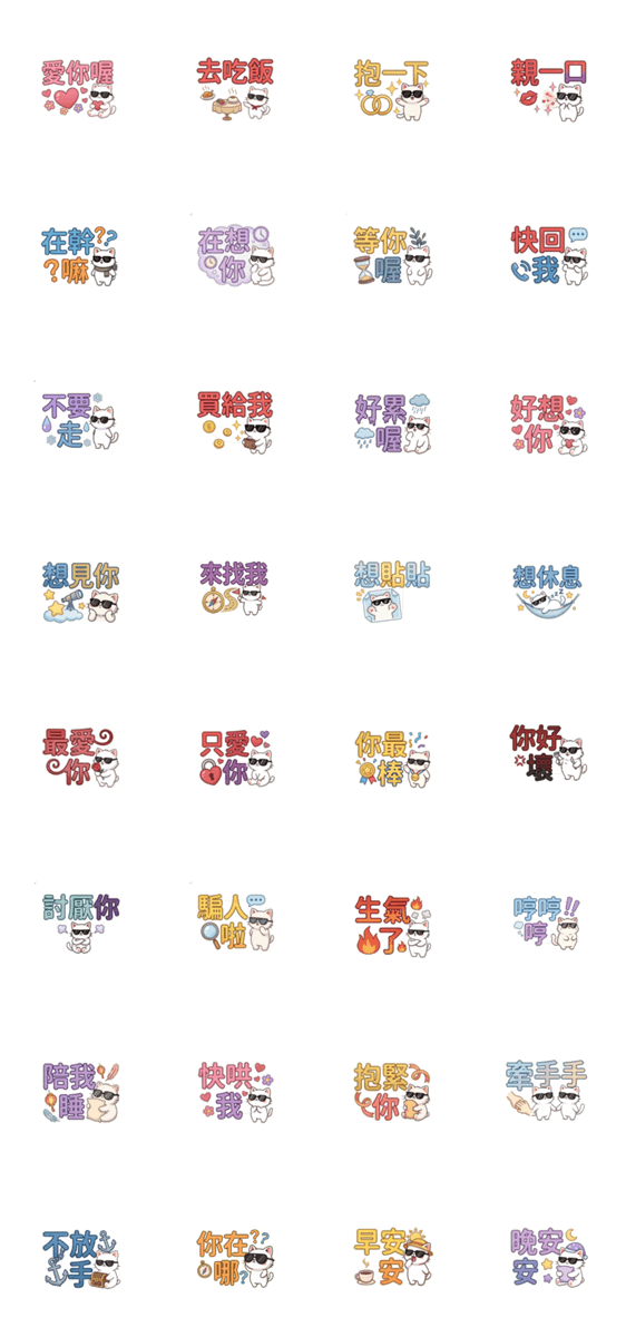 | スタンプ説明 | Sunglasses, white cat, miss you so much These stickers will show up extra large in chats. |