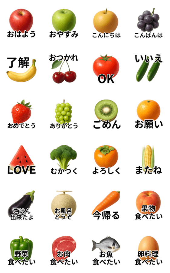 | スタンプ説明 | 実写みたいなフルーツと野菜と肉と魚と卵。りんご・グリーンアップル・梨・ぶどう・バナナ・チェリー・トマト・きゅうり・苺・マスカット・キウイ・みかん・卵料理食べたい |