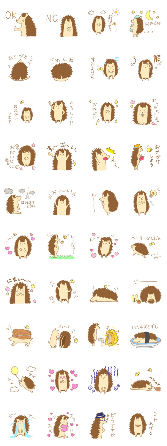 | スタンプ説明 | 気まぐれなハリネズミのスタンプです!背中のハリは気分でつけかえている。蝶の友達と、たわしが大好き。 |