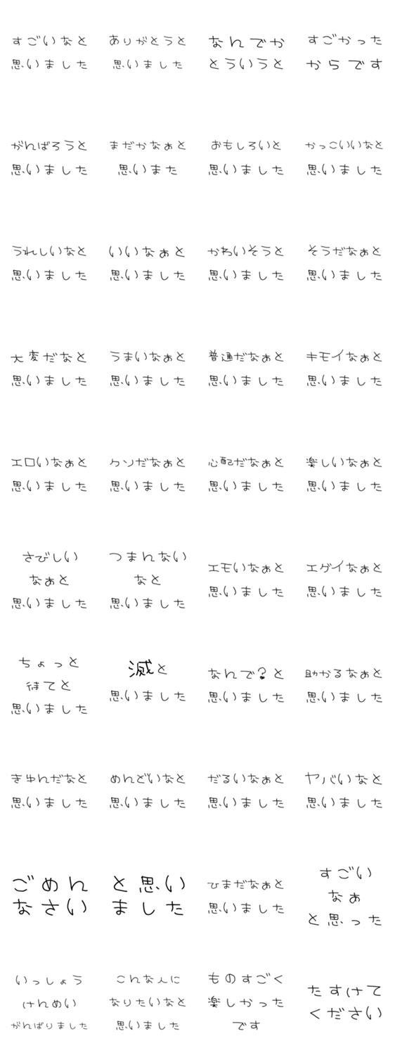 | スタンプ説明 | 日常/返信/既読/ジョーク/毎日/面白い/友達/ネタ/かわいい/手書き/ガキ/子供/こども/小学生/文章/感情/感想/すごい/思う/テンプレ/仲良し/シュール/好き/5才/幼稚園/小 |