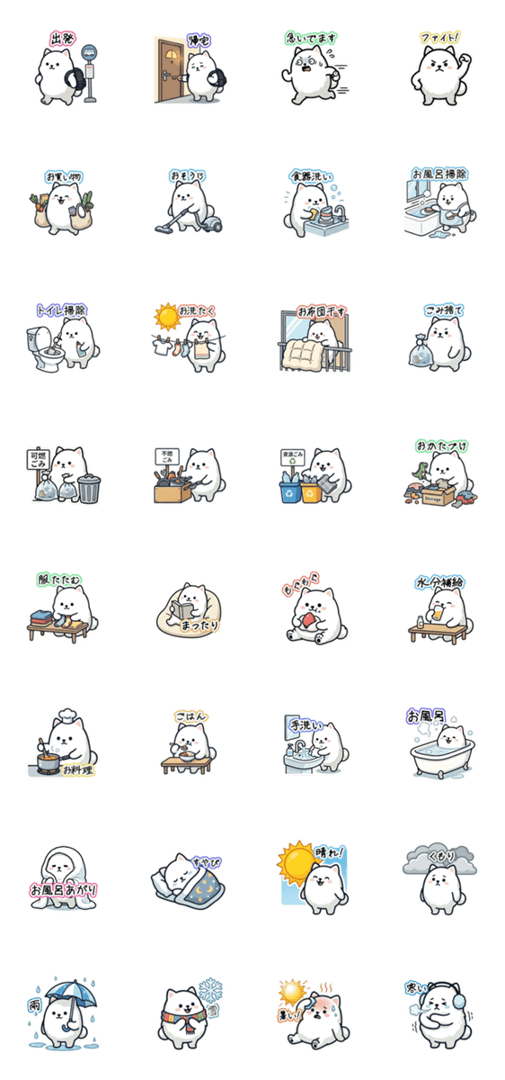 白い犬のような何かのスタンプです。自称ポメラミアンらしい。 (生活/天気/ゴミ出し/掃除)