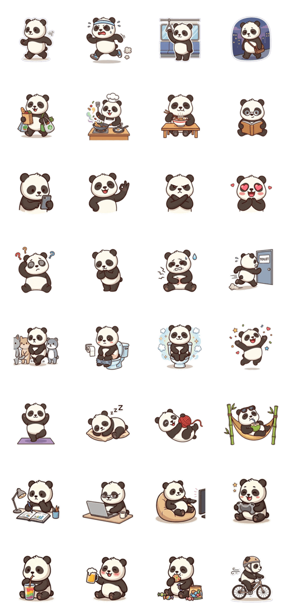 パンダくんの生活に密着したスタンプです。もちろんトイレにも行きます。(文字なし)