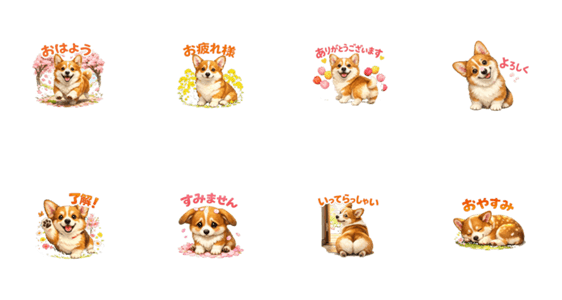 ウェルシュ・コーギーが春をお届け!桜や菜の花に囲まれたリアルめで温かみのあるイラストスタンプです。毎日使える挨拶を、コーギーらしい愛くるしい仕草で揃えました。