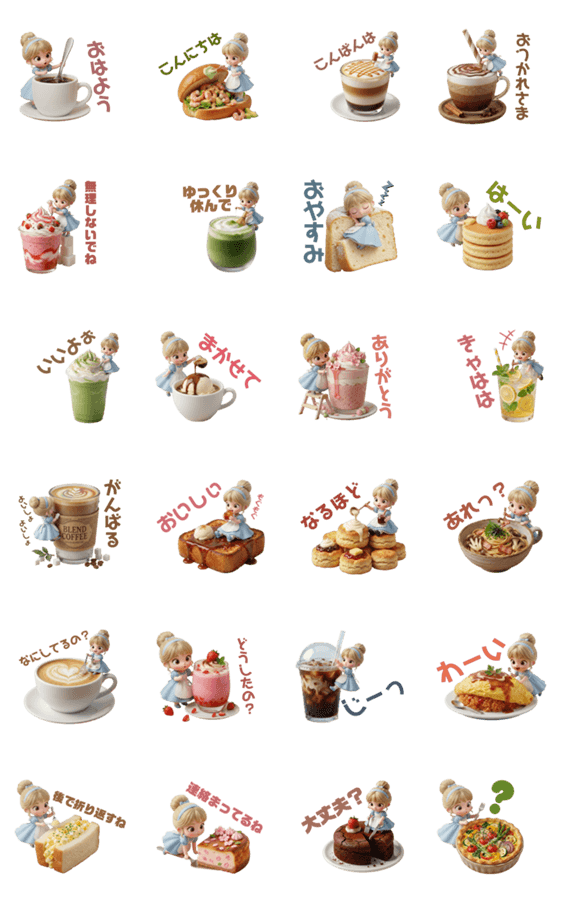 | スタンプ説明 | ちょっぴりドジでやさしいシンデレラのカフェスタンプ。魔法のような毎日を、かわいいリアクションで彩ります。挨拶/女の子/家族/友達/カップル/恋人/食べ物/飲み物 |