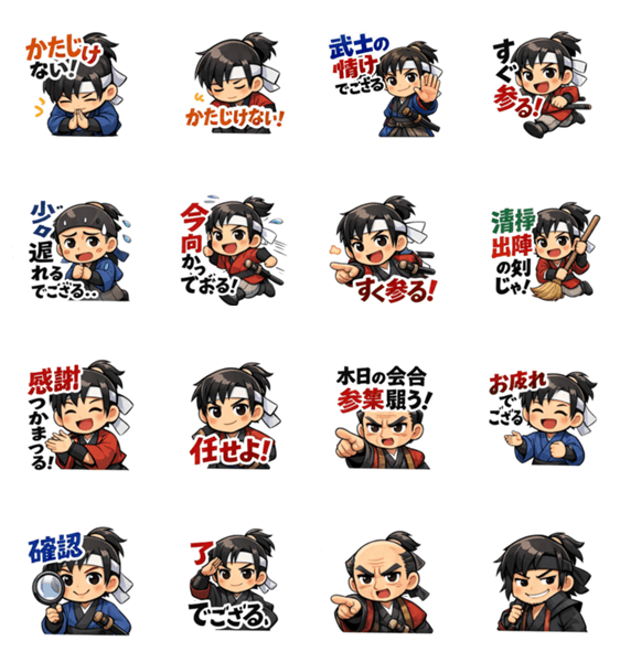 | スタンプ説明 | 町内会や日常連絡で使いやすい武士スタンプでござる。 感謝・連絡・確認など、誰でも使いやすい表現を揃え申した。 |