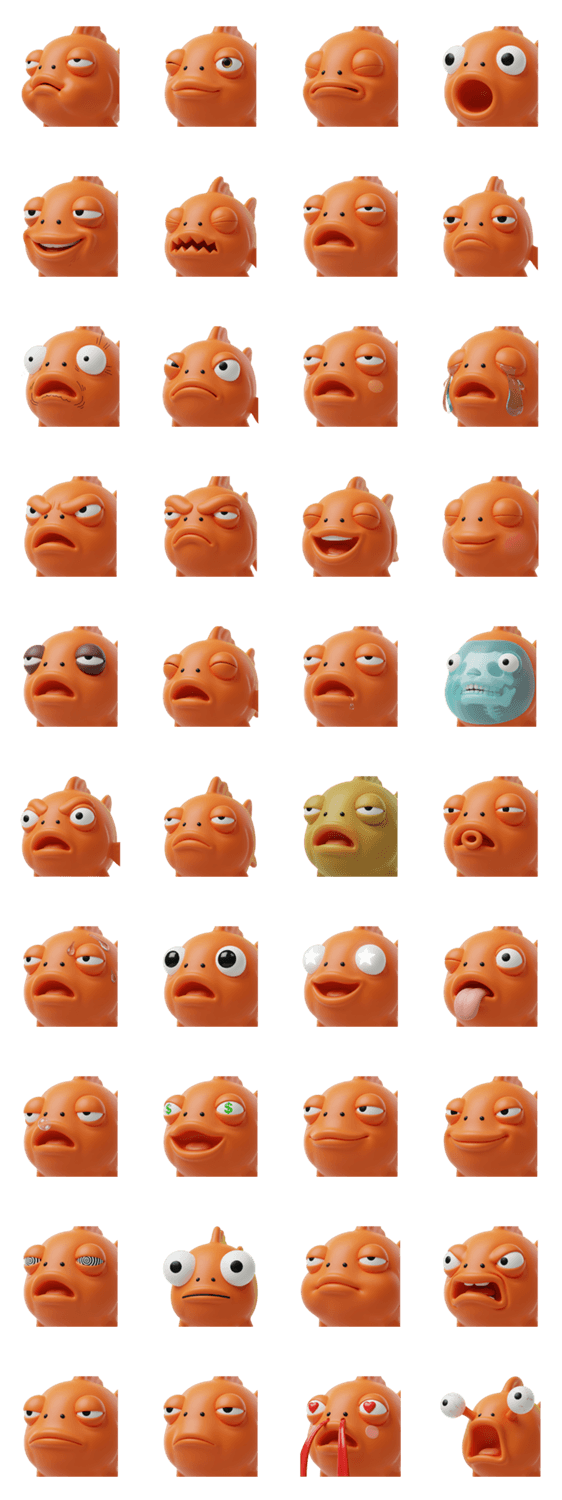 | スタンプ説明 | A text-free 3D goldfish sticker set! Full of cute, weird, and cynical expressions. Let these vivid faces speak for your daily moods without a single word. |