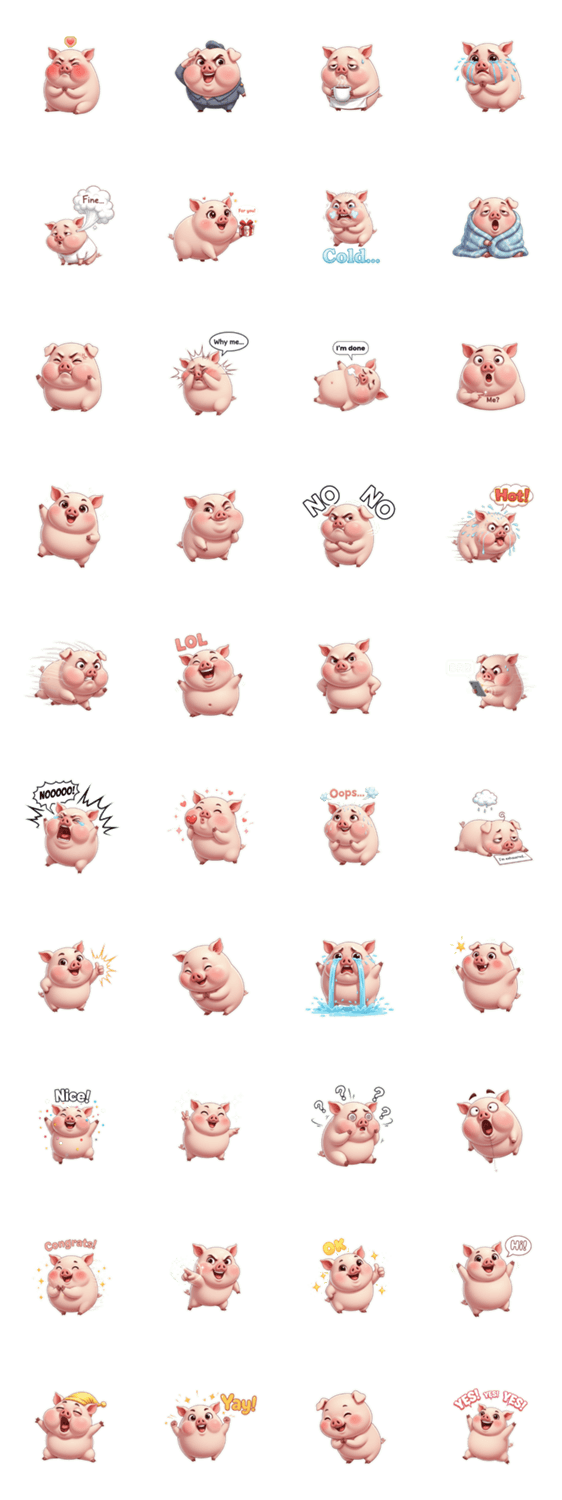 | スタンプ説明 | ぽっちゃりぶた超実用リアクション! 丸い体と可愛い表情で疲れたり困ったり驚いたりする反応を表現, チャットで使いやすいスタンプ |