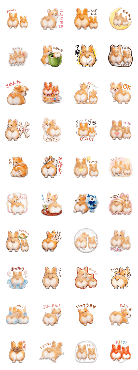| スタンプ説明 | コーギーのふわふわした可愛いスタンプが登場! ぷっくりシールで可愛い!! |