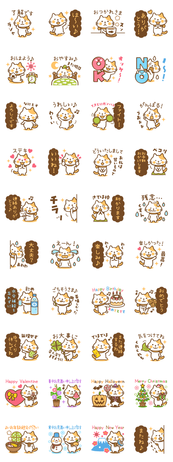 | スタンプ説明 | 一年中使える茶白トビ猫のねこ田さんのシンプルなスタンプが出来ました。日常で使えるスタンプの他、ハロウィン クリスマス 年賀などの季節のスタンプ付き! |