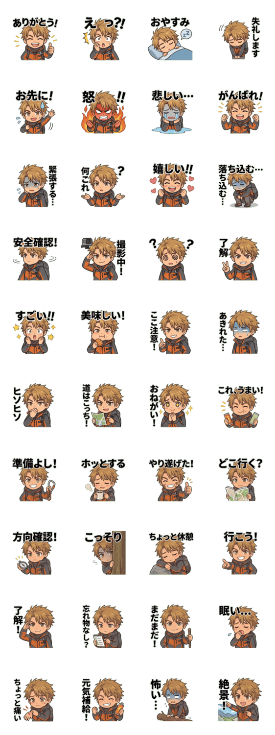 | スタンプ説明 | 架空のオリジナルキャラクター「嵐山風汰」(23歳・アウトドアYouTuber)のオリジナルスタンプです。 |