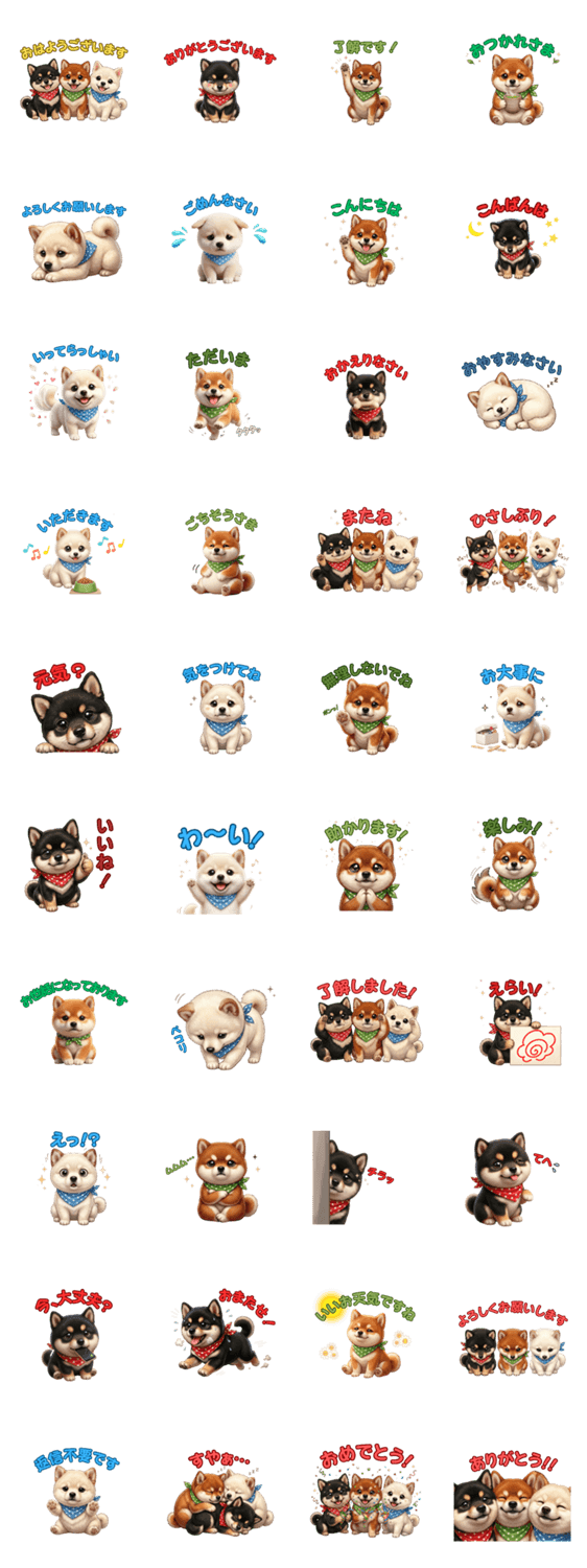 | スタンプ説明 | 仲良し柴犬トリオが毎日のトークを「おはよう」から「おやすみ」までサポート✨これ一つで会話が成立する『あると助かる』基本の挨拶セットです♪ |