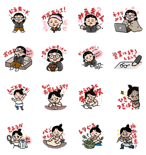 | スタンプ説明 | カフェで働くあきこ様とお家で過ごすあきこ様 |