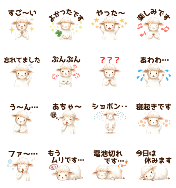 | スタンプ説明 | ふわふわ癒し系”ひつじん”スタンプ第2弾♪心に浮かぶあなたの気持ち、ちょっと言いにくいことも代わりに可愛く伝えてくれちゃう♪便利なセットです。見やすいデカ文字! |