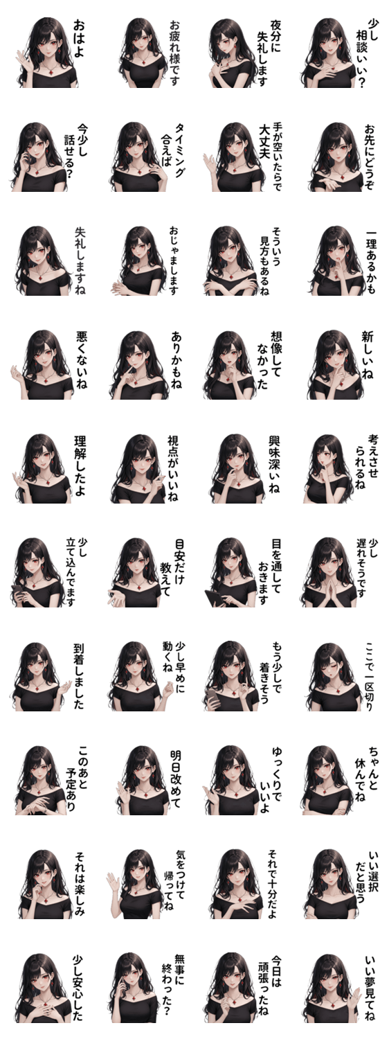 | スタンプ説明 | ちょっと余裕な大人女子の日常で使いやすいひとこと。落ち着きとやさしさを感じる表情で、あいさつ・返事・気持ちを自然に伝えられます。大人かわいいスタンプです。 |