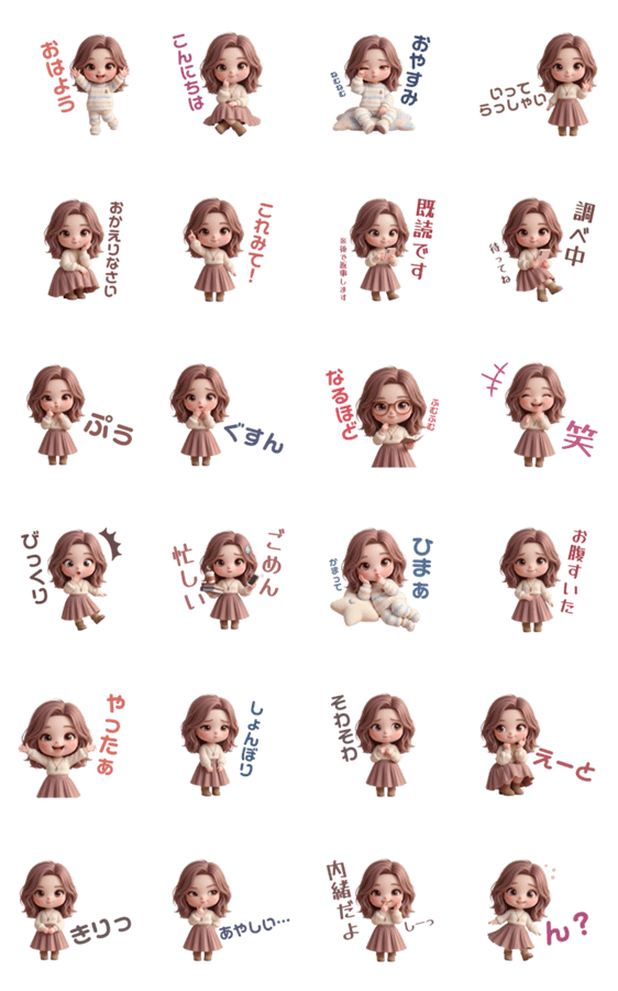 | スタンプ説明 | 3Dのぷにぷに質感がかわいい、淡色系オシャレ女子の日常スタンプです。恋人/カップル/友達/家族/挨拶/リアクション/女の子/AI |