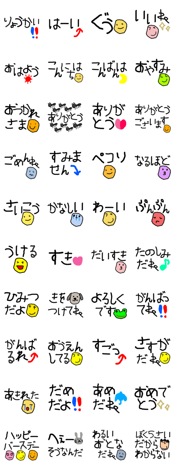 | スタンプ説明 | ひらがな練習中の5歳の子が書いた文字と絵文字です 子どもの字/ひらがな/左利き/へたくそな字/幼稚園児/保育園児/面白い/かわいい/毎日使えるスタンプ/小学生/日常/挨拶 |