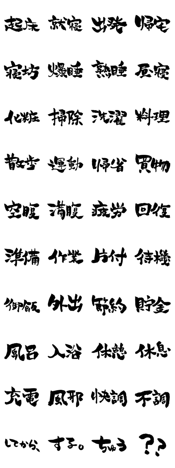 | スタンプ説明 | 日常で使える言葉を、クセ強な筆文字で。 ちょっとした連絡も、気軽なやりとりにも。 まいにち使えて、雰囲気が伝わる筆文字スタンプ。スタンプアレンジにも! |