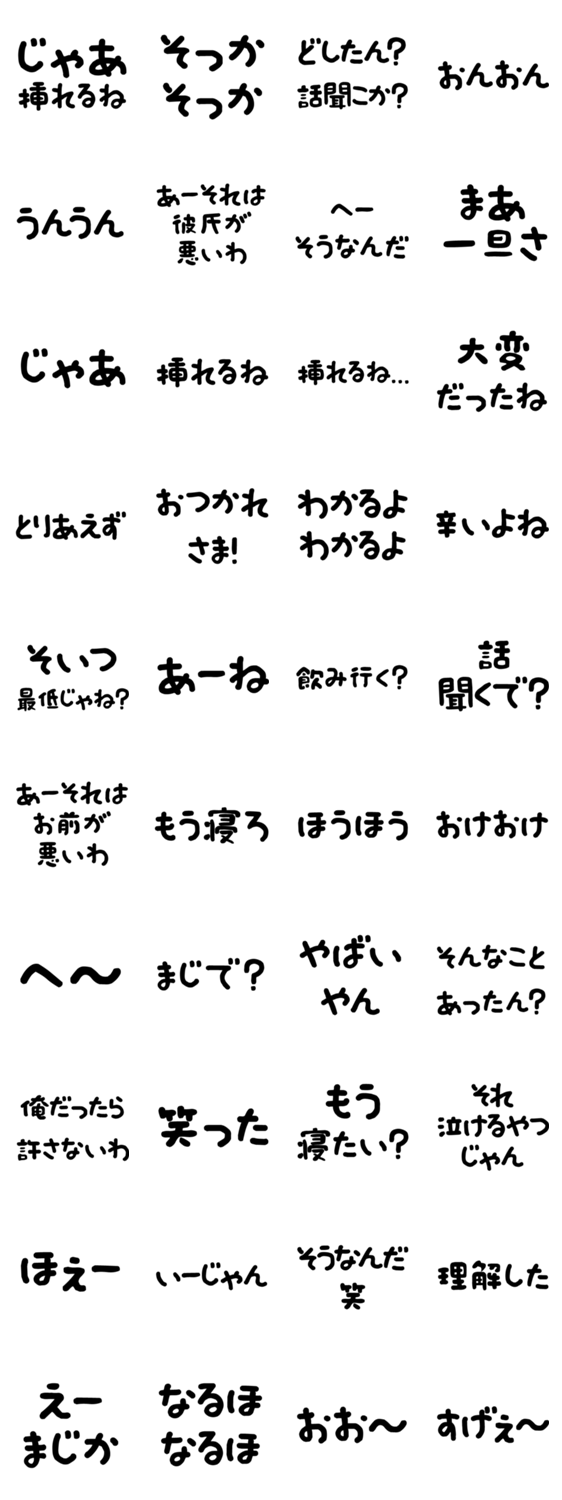 | スタンプ説明 | 日常/夫婦/文字/変態/ウケる/下ネタ/かわいい/嫁/旦那/敬語/甘め/ツンデレ/返信/既読/毎日/仲良し/スケベ/下品/愛/恋/おーい/イチャラブ/好き/カップル/褒める/こども |