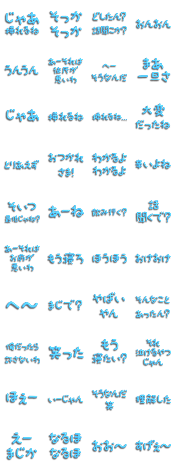 | スタンプ説明 | 日常/夫婦/ぷっくり/文字/変態/ウケる/下ネタ/かわいい/嫁/旦那/敬語/甘め/ツンデレ/返信/既読/毎日/仲良し/スケベ/立体/3D/つやつや/愛/恋/おーい/好き/ボンボン/イチャ |