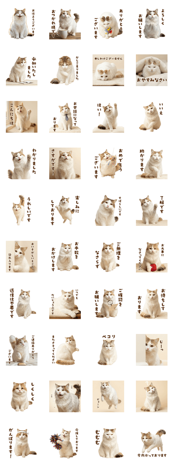 | スタンプ説明 | ず〜っと使い倒せる敬語スタンプ。ふわふわな長毛茶白猫(白猫)の、毎日使える便利なスタンプです。大人かわいい丁寧な言葉遣いで、毎日のトークを優しく彩ります。 |