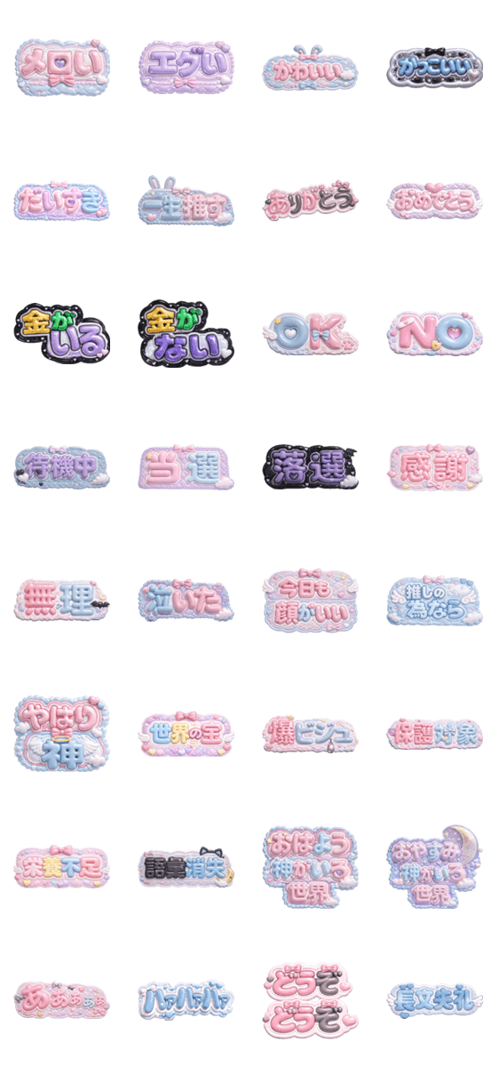 | スタンプ説明 | 推し活や日常遣いに♡3D/自担/オタク/ヲタ/コンサート/ライブ/オタ活/推しメン/アイドル/ファン/ネムボ/デコ文字/デコレーション/立体/ぷくぷく/ボンボン/ホスト |