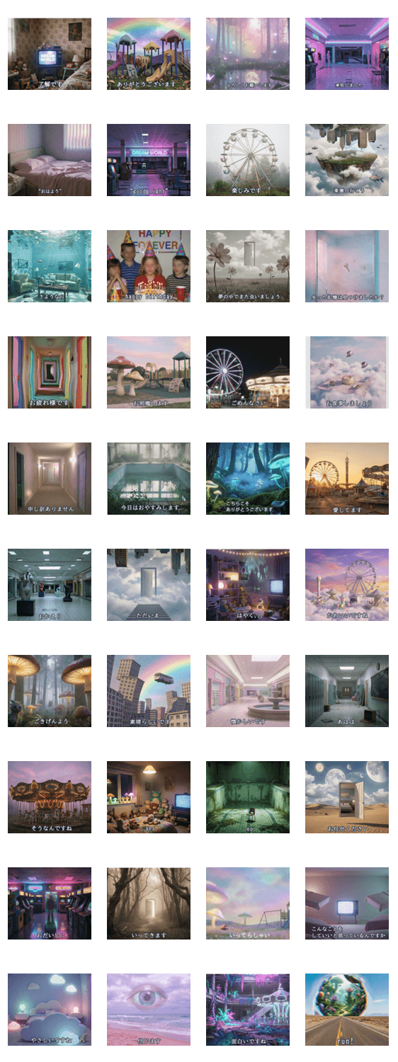 | スタンプ説明 | 写真風 リアル 夢 幻想 ノスタルジー 不気味 エモい レトロ シュール 非現実 日常 使いやすい 人気 トーク用 LINEスタンプ aesthetic 不思議 深夜系 ゆるい ずっと使える |
